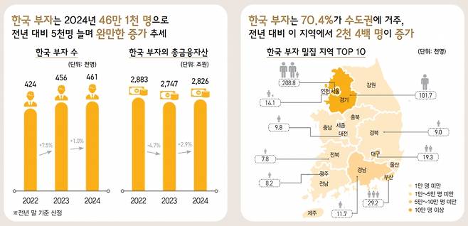 22일 KB금융그룹이 발간한 '2024 한국 부자 보고서'에 따르면 올해 금융자산이 10억원 이상인 부자는 46만1000명으로 전체 인구의 0.9%를 차지했다. 지난해 대비 1%(5000명) 증가하는 데 그쳤는데, 통계 집계 이후 가장 낮은 증가율이다.