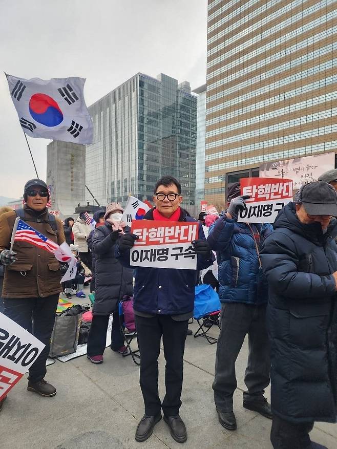| ▲ 충남도의회 부의장직을 맡고 있는 정광섭 의원(태안 2?국민의힘)이 21일 서울 광화문인근에서 대한민국바로세우기국민운동본부(대국본), 자유통일당 등에서 주최한 집회에 참석해 '탄핵 반대, 이재명 구속' 손팻말 들고 있다. |