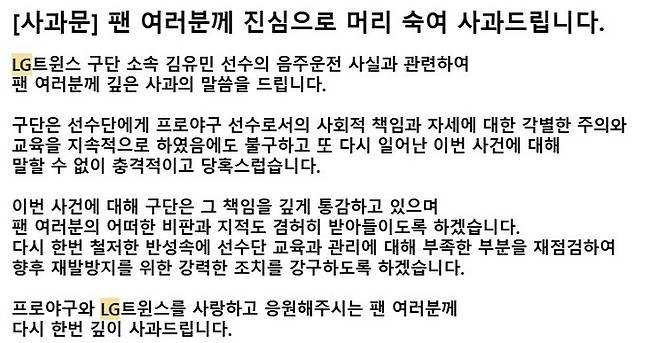 선수단 관리가 전혀 안 되는 모습이다. LG가 또 다시 소속 선수의 음주운전 사실이 적발됐다. 지난 13일 투수 이상영이 KBO로부터 1년 실격처분 징계를 받은지 며칠 지나지 않아 4년차 신예 내야수 김유민이 음주운전으로 1년 실격처분 징계를 받았다.