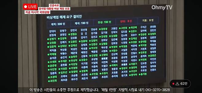 | ▲ 4일 오전 1시 1분, 비상 계엄 해제 요구 결의안이 가결되는 순간 국회 본회의장 전광판의 모습. 재석 190명에 190명 전원 찬성했다. |
