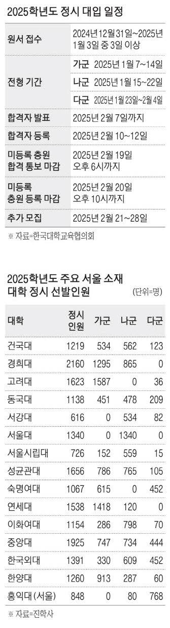 올해 수험생들은 상향 지원의 폭을 넓혀야 한다는 의견도 있다. 종로학원에 따르면 지난해 수험생들이 지원한 2024학년도 정시모집에서 서울 소재 대학의 추가 합격자를 고려한 실질 경쟁률은 최초 경쟁률의 절반인 2.6대1 수준으로 나타났다. 임성호 종로학원 대표는 "올해는 의과대학 모집정원 확대 등 변수로 인해 중복 합격자가 늘면서 서울 소재 대학 경쟁률이 더 떨어질 것으로 보인다"며 "수험생들은 추이를 살피면서 상향 지원의 폭을 넓힐 필요가 있다"고 말했다.