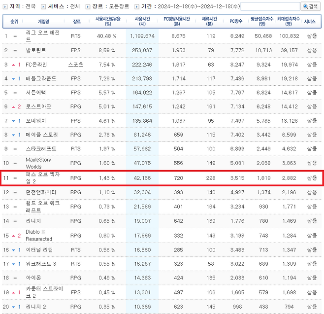 지난 20일 카카오게임즈는 PC방 게임 전문 리서치 서비스 게임트릭스가 집계한 데이터를 통해 POE2가 12월 셋째주 온라인 게임 순위에서 11위(18일 기준)을 기록했다고 밝혔다. 특히 체류시간은 228분을 차지하며 20위권 내 게임 중 가장 높은 수치를 달성했다.