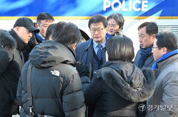 22일 오후 서울 서초구 남태령 도로 위에 전국농민회총연맹 전봉준 투쟁단의 트랙터와 트럭 등이 멈춰 서 있다. 전날 윤석열 대통령 구속 및 양곡법 개정에 대해 촉구하며 트랙터 상경 시위에 나섰다 이곳에서 경찰에 의해 저지된 전봉준 투쟁단과 진보 단체 및 시민들이 밤새 대치하고 있다. 사진은 더불어민주당 김준혁 의원 외 국회 행정안전위원회 소속 의원들이 경찰과 협상을 하고 있다.