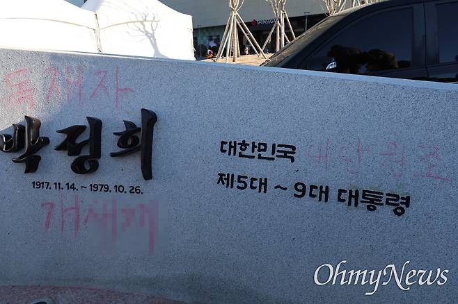 | ▲ 대구시가 동대구역 광장에 박정희 동상을 세우자 시민들이 박정희 이름 위에 '독재자'라는 낙서를 써 놓았다. |