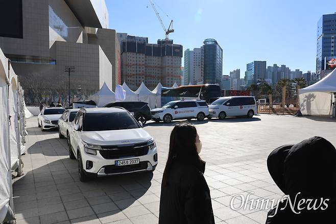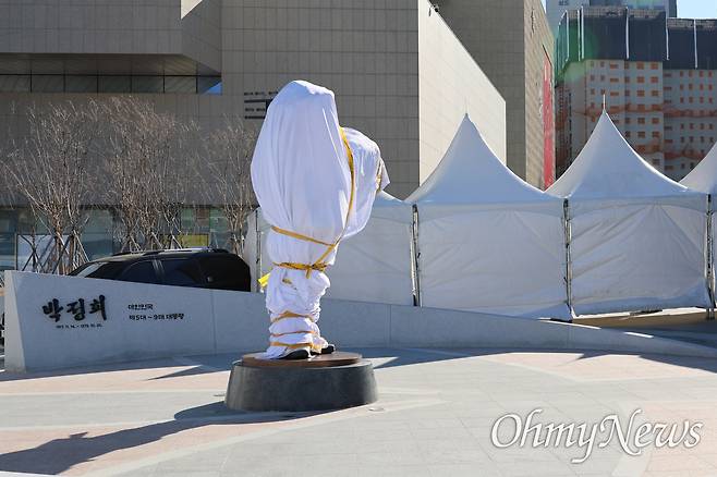 | ▲ 제막 전날 박정희동상, 시민들이 흰 천 뜯었는데 [현장] 대구 동대구역 광장에 '박정희 광장' 표지판을 설치한 대구시가 12월 23일 박정희 동상을 세우고 제막식을 열기로 하자 대구시민들이 단체행동에 나섰다. 박정희 동상 주변에 접근하기 어렵게 승합차들이 세워져 있었다. 시민들이 동상을 둘러싸고 있는 흰 천을 뜯어내자 드러난 것은... 취재 조정훈 기자 ⓒ 조정훈 |