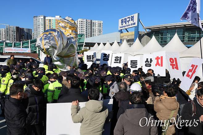 | ▲ 대구시가 동대구역 광장에 박정희 동상을 세우자 시민단체가 동상에 씌워진 천막을 걷어내는 등 강하게 규탄하면서 경찰과 충돌을 빚기도 했다. |
