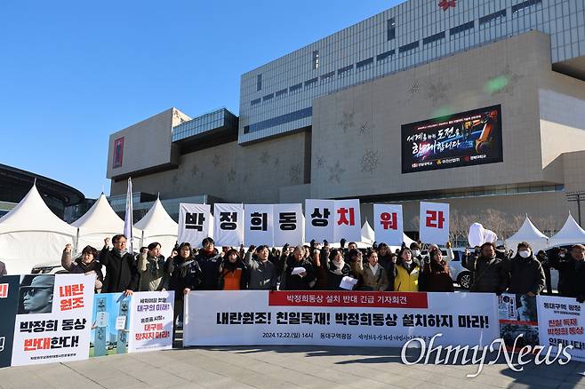 동대구역 광장에 박정희 동상이 들어서자 22일 오후 시민단체와 지역 야당이 기자회견을 열고 "내란원조, 친일독재 박정희 동상, 당장 걷어치워라"라고 규탄했다.