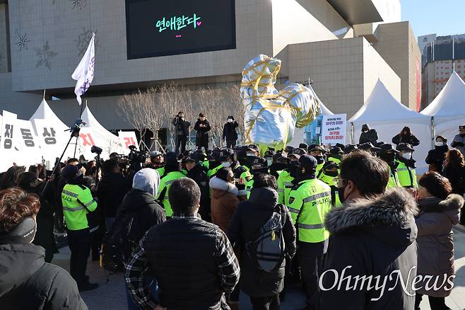 | ▲ 대구시가 동대구역 광장에 박정희 동상을 세우자 시민단체가 22일 오후 기자회견을 가진 뒤 동상 천막을 벗겨내려 하자 경찰이 동상 주위를 에워싸고 있다. |