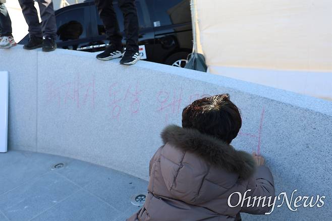 | ▲ 대구시가 동대구역 광장에 박정희 동상을 세우자 한 시민이 '독재자 동상 왠 말이냐'라는 글을 쓰고 있다. |