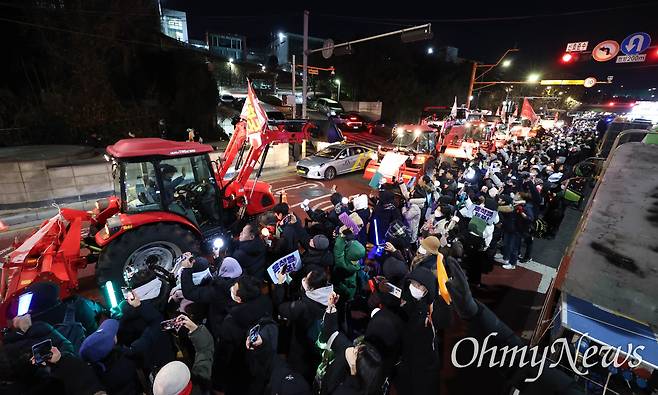 | ▲ [현장] '남태령' 트랙터 한남동 진입하자... '축포'가 들려왔다 ⓒ 권우성 |