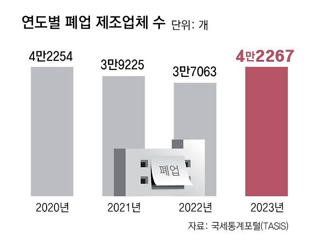 지난달 경기 포천시에서 만난 김모 씨(60)는 2022년 섬유 공장 문을 닫았다. 외환위기 직후인 1999년 세워 연매출이 한때 200억 원까지 올랐던 공장이다. 그는 “최저임금, 주 52시간제로 인건비가 베트남보다 너덧 배는 비싸다”면서 “주변 공장주들이 먼저 폐업한 제게 ‘너무 부럽다’고 하는 데는 이유가 다 있다”고 했다. 그가 약 10년간 조합장으로 활동했던 경기북부 섬유조합 회원사는 2020년 237개에서 올해 160개로 줄었다. 4년 새 3곳 중 1곳이 사라진 것이다.