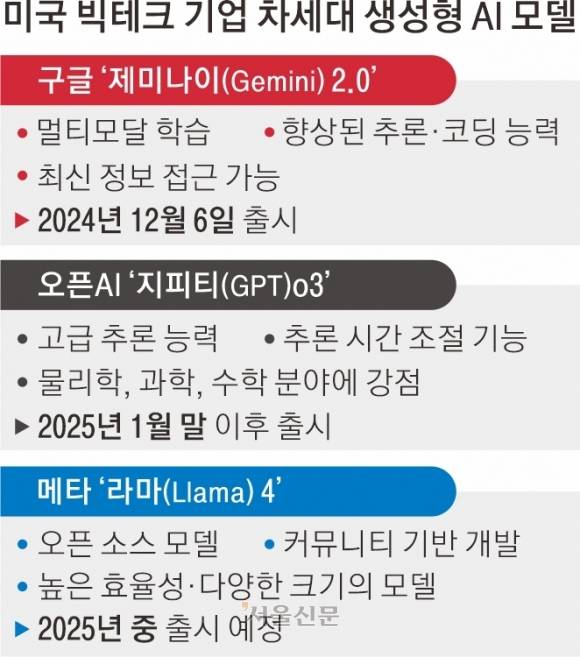 오픈AI의 대규모 언어 모델(LLM) 성능이 한층 개선됨에 따라 구글이나 메타 등 빅테크와의 경쟁도 가속화될 것으로 보인다. 구글은 이달 초 멀티모달 학습이 가능한 ‘제미나이 2.0’을 공식 출시했다. 뛰어난 추론 능력과 함께 구글 검색에 접근해 날씨나 뉴스 등 최신 정보를 제공한다는 차별점이 있다.