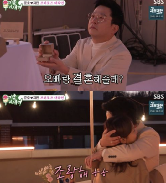 그리고 무릎 꿇은 채 반지를 전한 김준호는 "오빠랑 결혼해줄래?"라고 청혼했고, 김지민은 "껴 줘"라며 프러포즈를 승낙하며 결혼을 약속했다.