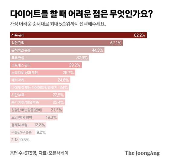 다이어트의 시작은 역시 ‘식습관’이다. 무엇을, 얼마나 먹느냐에 따라 내 몸이 달라지기 때문이다. 하지만 이를 참는 것만큼 어려운 일이 없다. 오픈서베이가 전국의 10~60대 남녀 675명에게 ‘다이어트를 할 때 가장 어려운 점(가장 어려운 순서대로 최대 5순위까지 선택)’을 물은 결과 62.2%의 응답자가 '식욕 관리'를 꼽아 1위를 차지했다. 이어 식단 관리(52.1%), 규칙적인 운동(44.3%), 요요 현상(32.3%), 스트레스 관리(29.2%) 순으로 나타났다. 1·2위가 모두 음식 관리에 대한 어려움을 차지한 것이다.