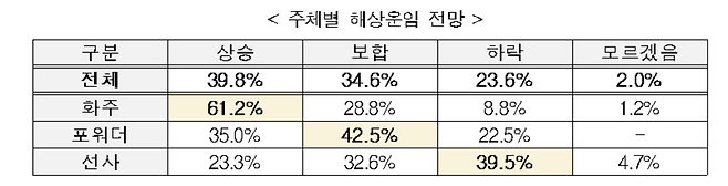 한국무역협회(회장 윤진식)가 23일 발표한 ‘2025년 글로벌 해상운임 전망 설문조사’ 결과에 따르면, 화주·선사·포워더로 구성된 응답자의 74.4%가 내년도 해상운임이 상승(39.8%)하거나 현 수준을 유지(34.6%)할 것으로 예상했다. 반면 운임이 하락할 것으로 전망한 응답은 23.6%에 불과했다.