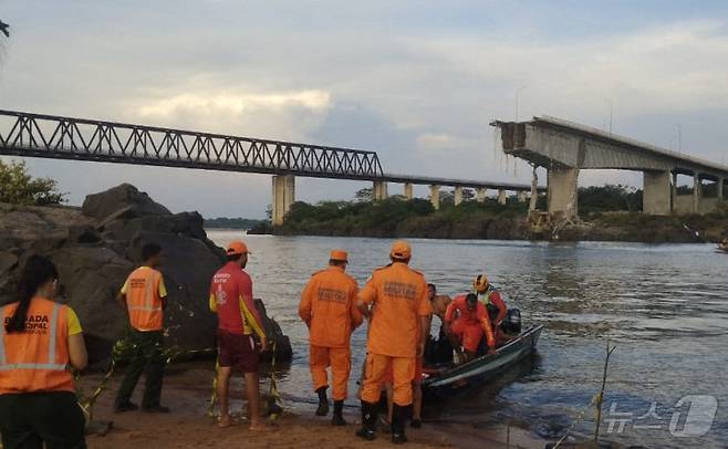 (토간틴스 AFP=뉴스1) 우동명 기자 = 22일 (현지시간) 브라질 토간틴스 강을 가로지르는 교량이 무너진 현장에 소방대원이 출동을 하고 있다. 2024.12.23