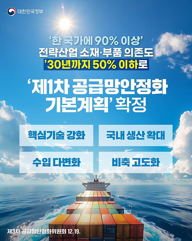 반도체, 배터리, 전기차 등 주요 전략산업 소재·부품의 특정국 의존도가 90% 이상으로 높은 상황인데요, 2030년까지 50% 이하로 낮출 계획입니다. 정부는 19일 제3차 공급망안정화위원회를 열고 향후 3년간 공급망 정책의 기본 틀이 될 제1차 공급망안정화 기본계획(’25~’27)을 확정했습니다. 글로벌 공급망 불확실성이 커지고 있는 상황에서, 공급망 리스크를 헤쳐나갈 대응체계를 만들어 갈 것입니다.