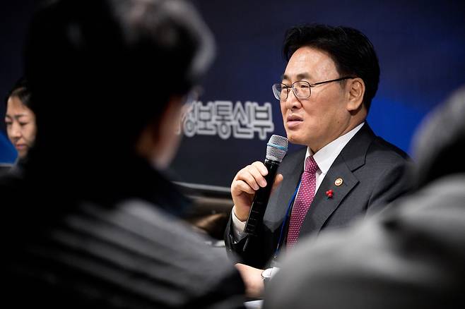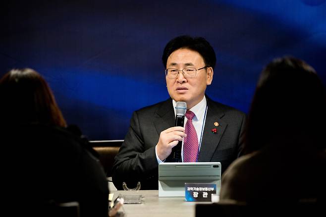 | ▲ 유상임 과학기술정보통신부 장관이 23일 오전 세종특별자치시 정부세종청사 인근 식당에서 열린 '과학기술정보통신부 기자간담회'에서 기자들과 질의응답을 하고 있다. |
