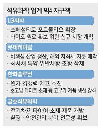 올 들어 3분기까지 LG화학, 롯데케미칼, 한화솔루션, 금호석유화학 등 석유화학 기업 '빅4'는 누적 영업손실이 5000억원대에 달할 정도로 위기설의 중심에 섰다. 이번 한파를 이겨내지 못하면 반등은 고사하고 생존조차 불투명해진다. 이들 빅4는 위기 극복을 위한 자구책 마련에 나서고 있다. 구조조정을 불사하며 경영진 교체부터 설비 매각, 인력 재조정 같은 동원할 수 있는 모든 방안을 강구하고 있다. 또한 고부가가치(스페셜티) 제품군에 연구개발(R&D) 역량을 집중해 위기 돌파 동력을 찾고 있다.