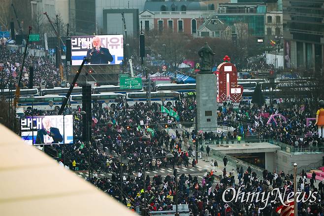 | ▲ 지난 21일 오후 서울 광화문네거리에서 열린 윤석열 탄핵 반대 집회에서 전광훈 목사가 연설하고 있다. |