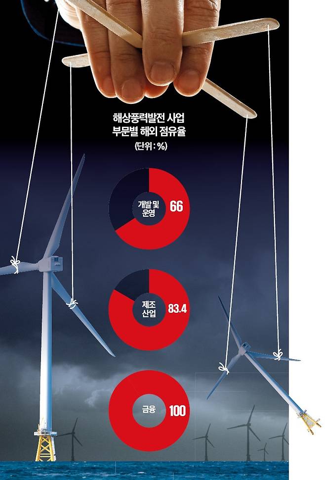 문제는 우리 시장을 지킬 수단이 마땅찮다는 점이다. 발전타워와 전선 같은 비핵심 제조산업을 제외하면 해상풍력 산업의 주도권이 이미 해외에 넘어갔기 때문이다. 올 8월 말 기준 88개 해상풍력 개발·운영권의 66%(발전용량 기준)를 해외 자본이 갖고 있다. 국내 발전 공기업 몫은 9개로 10%에 불과하다.
