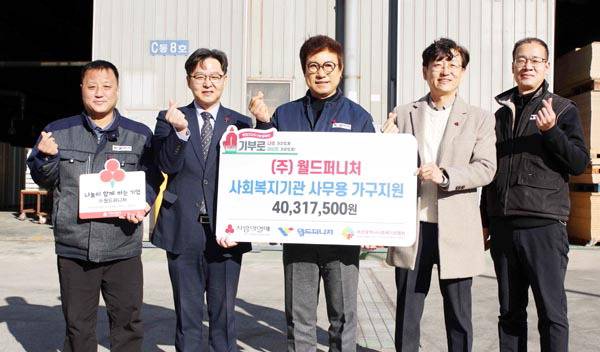 ㈜월드퍼니처는 친환경 OA 사무가구 전문업체로 2022년부터 부산사랑의열매를 통해 사회복지기관에 사무용 가구를 지원하고 있다. 올해도 4031만7500원 상당의 가구를 기탁했다.