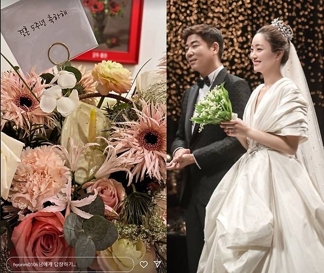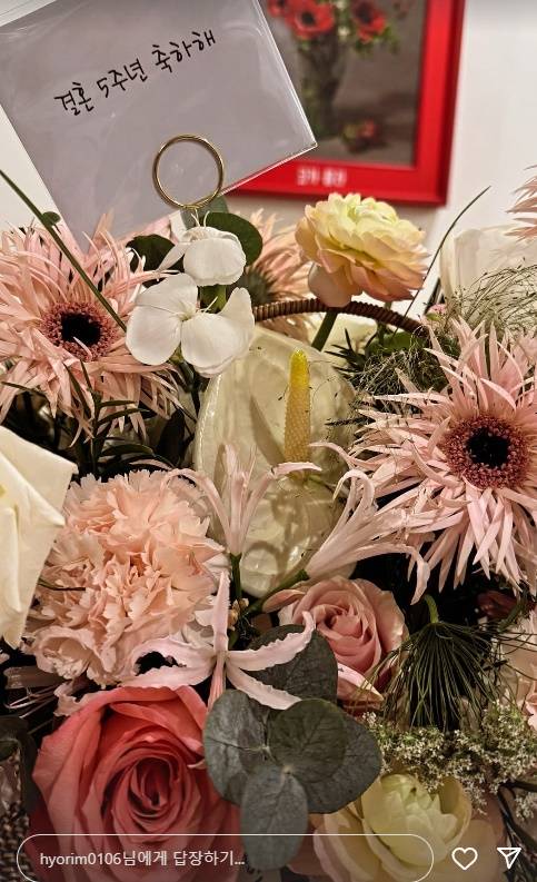 사진에는 꽃바구니와 함께 '결혼 5주년 축하해'라고 적힌 카드가 담겨 있다.