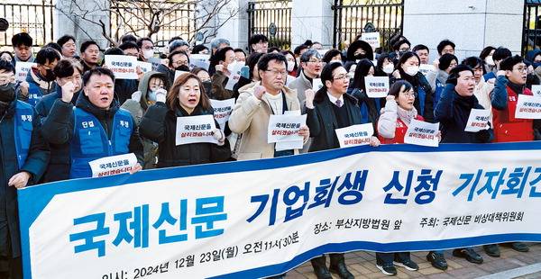 (사진설명 : 23일 국제신문 임직원들과 부산지역 시민·언론단체 회원들이 부산법원종합청사 앞에서 ‘국제신문 기업회생 신청 기자회견’을 열고 있다. 국제신문은 지난 20일 기업회생 신청을 하고 대주주 능인불교선양원(능인선원)과의 법적 분리 절차에 들어갔다. 국제신문 임직원은 이날 회견에서 기업회생을 통해 77년 전통의 지역 정론지 위상을 지켜내는 동시에 앞으로도 변함없이 부산 울산 경남 발전을 위한 조언자와 권력을 감시하는 파수꾼 역할에 충실할 것을 독자와 시민에게 약속했다. 전민철 기자 jmc@kookje.co.kr)