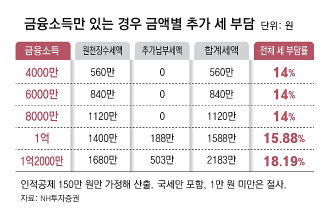 특히 금융소득만 약 8000만 원 있고 그 외 종합소득이 없는 경우 종합소득 추가납부 세액이 없다. 이미 연도 중에 14% 세율로 원천징수된 세금이 기납부세액으로 모두 차감되기 때문이다. 다만 납부할 세금이 없어도 종합소득세 신고는 해야 되고 건강보험료는 별도로 부과될 수 있다. 금융소득이 1억 원을 넘어 1억2000만 원이 될 때까지도 세 부담률은 20%를 밑돈다.