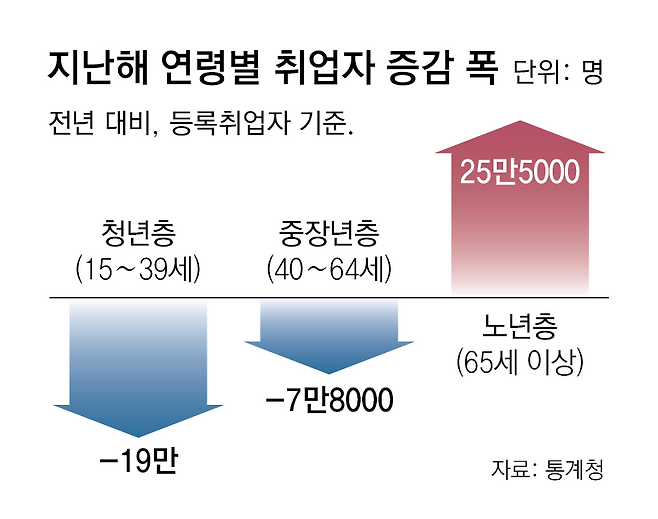 전 연령대 중 등록취업자 수가 증가한 건 노년층이 유일하다. 같은 기간 청년층(15∼39세·829만3000명)과 중장년층(40∼64세·1364만9000명) 취업자 수는 각각 19만 명, 7만8000명 감소했다. 지난해 전체 노년층 인구가 949만7000명이라는 것을 고려하면 3명 중 1명이 현재 일을 하고 있는 셈이다.