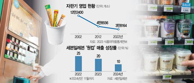 이 같은 현상에 자판기 커피를 즐기던 중장년층은 편의점 ‘원컵’ 상품을 대체재로 찾고 있다. 세븐일레븐에 따르면 최근 인스턴트 음료 시장 성장세가 주춤하는 가운데 종이컵 한 컵 용량의 다방 스타일 커피나 코코아 등을 맛볼 수 있는 ‘원컵’ 상품 매출이 꾸준히 증가세를 보이고 있다. 원컵 상품 매출은 2022년 25%, 2023년 20% 늘어난 데 이어 올해(1~11월)도 전년 동기 대비 10% 뛰었다.