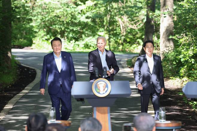 [캠프 데이비드 공동회견장 입장하는 한미일 정상 (연합뉴스 자료사진)]