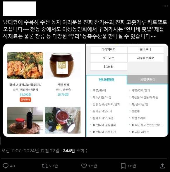 | ▲ 전여농 조합원들이 만든 협동조합인 '언니네 텃밭'도 그러한 후원 열풍의 수혜를 입은 곳 중 하나다. 언니네 텃밭을 맛난 우리 농산물을 구매할 수 있는 '진짜 참기름과 진짜 고춧가루 카르텔'로 소개한 한 X 유저의 게시글은 공유 2만 7천 회, 조회 수는 무려 344만 회에 달했다. |