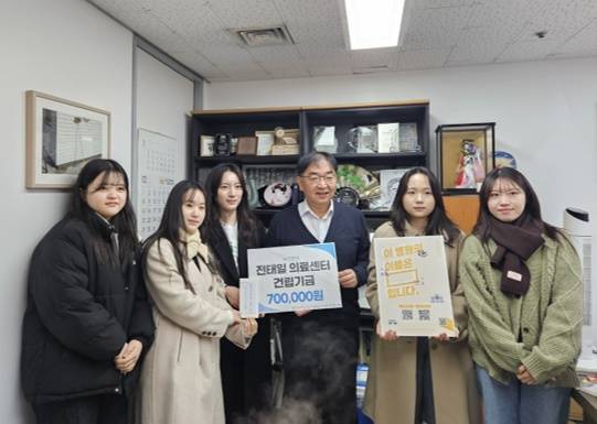 | ▲ 기부금 전달식 2024년 12월 7일(토) 5명의 경희대학생이 전태일의료센터 건립을 위해 모금한 70만원의 기부금을 녹색병원 임상혁 원장에게 전달하는 모습이다. |