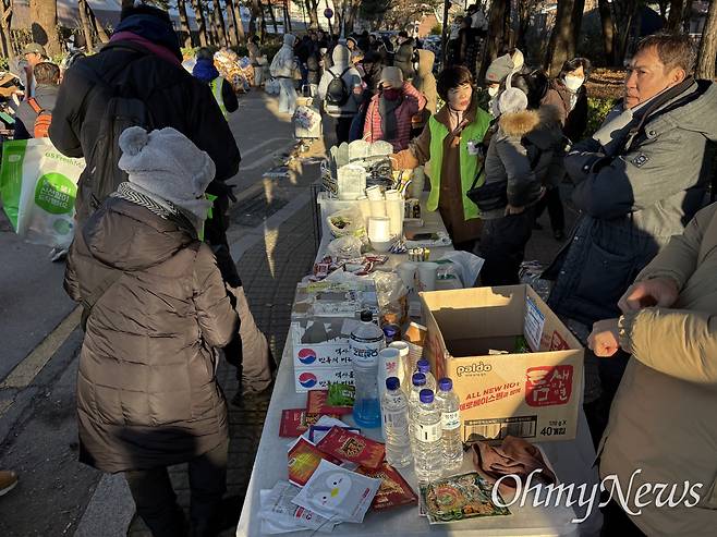 | ▲ 윤석열 대통령의 퇴진을 촉구하며 상경한 전국농민회총연맹 전봉준 투쟁단이 21일 서울 서초구 남태령 고개 인근에서 경찰에 저지된 뒤, 응원하는 시민들의 손길이 이어지고 있다. |