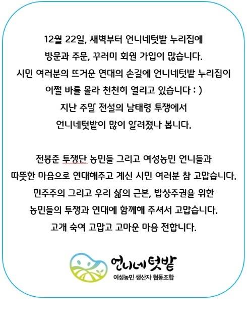 언니네 텃밭에 소속된 전여농 농민들을 '언니들'이라고 칭한 그는 "따뜻한 연대의 마음을 이렇게 행동으로 실천해 주셔서 너무 감사하다. 특히나 저는 여성 농민 언니들과 시민 여러분들을 잇는 역할을 하는 활동가이다 보니 그 추운 남태령까지 달려가서 함께해 주신 시민분들이 너무너무 감사했다"면서 "남태령에도 언니네 텃밭의 농민 언니들이 많이 나가 계셨다. 언니들과 물리적으로 함께 계셔준 것을 넘어서 언니네 텃밭까지 찾아와 마음을 보태주고 계신 걸 농민 언니들께 알려드리니 '너무 고맙고 몸 둘 바를 모르겠다'며 많이 놀라고 감동하셨다"며 '언니들'이 느끼는 감동과 고마움을 시민들에게 꼭 전해주고 싶다고 했다.