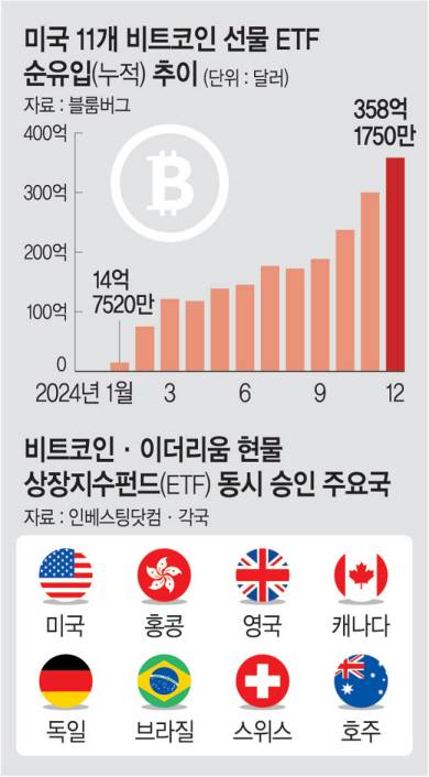 24일 블룸버그에 따르면 지난 1월 12일부터 이달 20일까지 비트코인 현물 ETF를 취급하는 11개 상품에서 358억1750만 달러(52조285억 원)가 순유입된 것으로 집계됐다. ETF는 시장 지수나 여러 주식 종목을 기초자산으로 펀드를 구성한 뒤 이를 증권거래소에 상장시켜 주식처럼 거래할 수 있도록 만든 상품이다. 비트코인이라는 단일 상품으로 펀드를 만들었음에도 시가총액 규모가 우리나라 상장사 기준 5위에 달한다. 미국 대선에서 트럼프 당선과 맞물리면서 11월과 12월 121억116만 달러가 순증하는 등 비트코인을 ‘전략자산’으로 비축하겠다는 미국의 입김에 산업이 들썩이고 있다. 여기에 미국은 지난 7월 가상화폐 중 두 번째로 시가총액 규모가 큰 이더리움 현물 ETF를 승인했다. 다른 국가들도 이러한 변화에 빠르게 반응하고 있다. 현재 비트코인·이더리움 현물 ETF 동시 승인 국가는 8개국(미국·홍콩·영국·캐나다·독일·브라질·스위스·호주)이다.