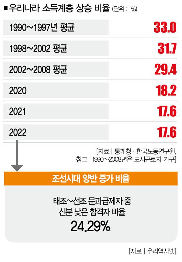 현재 우리나라의 사회이동성 상향 비율은 17세기 조선시대의 양반 증가 비율과 비교해볼 만하다. 국사편찬위원회의 우리역사넷에 따르면 1678~1789년 사회지도층인 양반 인구는 평균 20% 이상 증가했고, 19세기에는 40~60% 늘어났다.