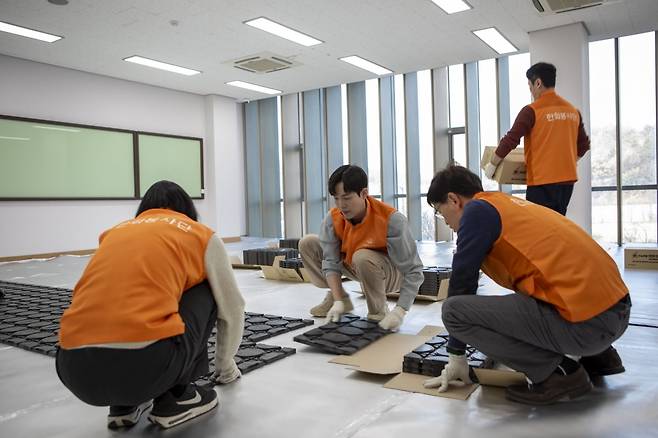 한화토탈에너지스의 '플라스틱 자원순환 캠페인'은 직원들이 사용한 다회용 컵을 재활용해 생산한 온돌 매트를 지역 자활센터 등에 기증하는 사회공헌활동이다.