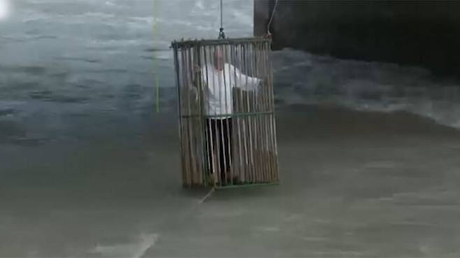 우리에 들어 있는 한 남성을 차디찬 강물에 빠뜨리는데 다들 이 모습을 가만히 지켜보고만 있습니다.