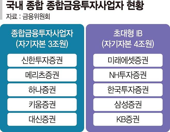이와 함께 헤지펀드에 자금을 대출하는 프라임브로커리지서비스(PBS)도 가능해지는 등 영업여건이 대폭 개선된다. 일반 국민·기업을 상대로 한 외화 일반환전 업무도 증권사 중에서도 종투사에만 허용된다.