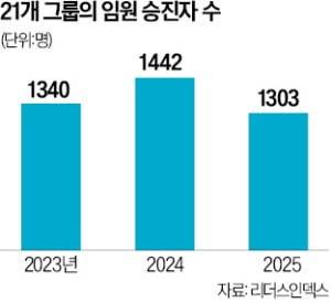 24일 기업분석연구소 리더스인덱스에 따르면 자산 기준 30대 대기업집단 가운데 지난 20일까지 임원 인사를 발표한 21개 그룹, 245개 계열사에서 신규 선임한 임원은 모두 1303명으로 집계됐다. 1년 전 1442명보다 9.6%(139명) 줄어든 수치다. 임원 승진자가 나온 계열사는 156개로 1년 전(152개)보다 늘었지만, 전체 임원 승진자 수는 오히려 줄었다.