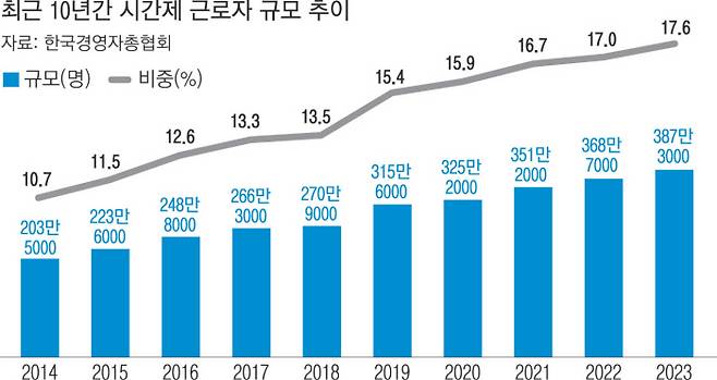 한국경영자총협회는 이 같은 내용을 담은 ‘지난 10년(2014∼2023)간 시간제 근로자의 변화와 시사점’ 보고서를 24일 발표했다.