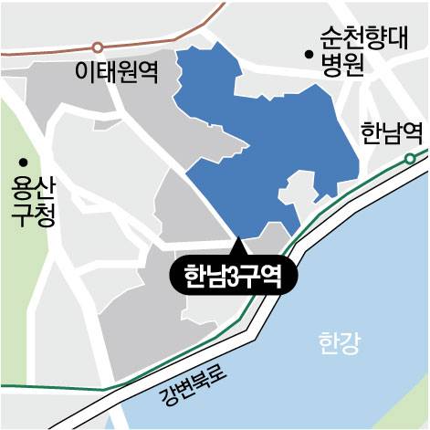 한남3구역은 면적이 38만6364㎡에 달해 서울 시내 재개발 사업장 중 규모가 가장 크다. 2009년 재정비 촉진구역으로 지정된 뒤 2026년 착공을 목표로 현재 이주가 진행 중이다. 시공사는 현대건설이다.