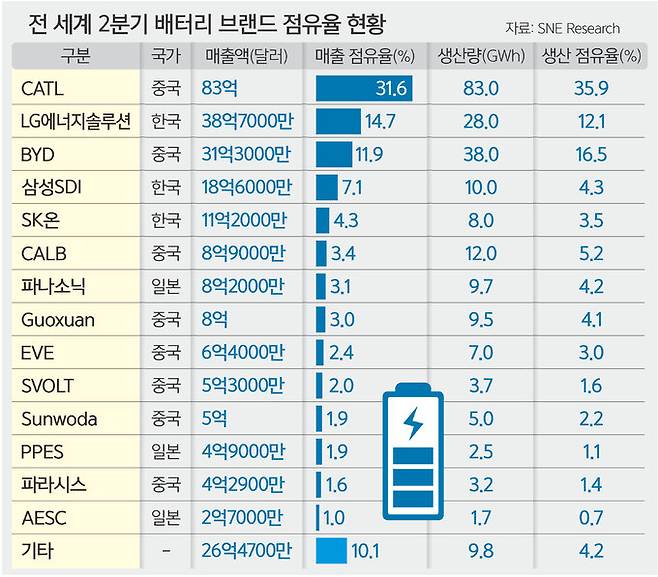 올해 2분기 기준으로는 BYD 배터리 생산량 점유율(16.5%)이 처음으로 LG에너지솔루션 점유율(12.1%)을 넘어 2위에 등극했다. 물론 매출 점유율은 아직 LG에너지솔루션이 14.7%로 2위를 지키고 있지만, 3위인 BYD(11.9%)가 바짝 따라붙는 모양새다.