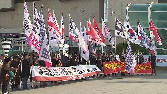 비슷한 시각, 동상 건립에 찬성하는 구국 대구 투쟁본부는 태극기, 성조기와 함께 부국강병 박정희 정신을 이어가자는 현수막을 들었습니다.