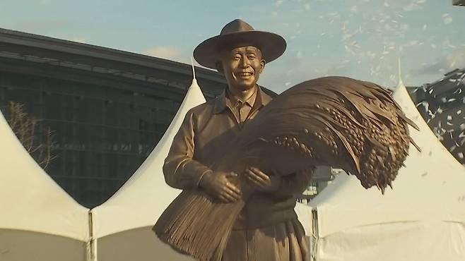 동상 둘레석에는 '보릿고개 넘어온 길, 자나 깨나 농민 생각' '재임 18년 동안 모내기, 벼 베기를 한 해도 거르지 않은 대통령' 등 글귀가 새겨졌습니다.