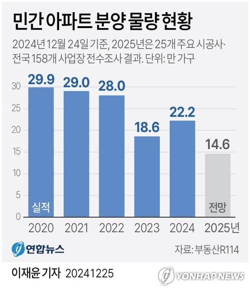 (서울=연합뉴스) 이재윤 기자 = 25일 연합뉴스가 부동산 정보업체 부동산R114와 공동으로 25개 주요 시공사의 내년도 분양 물량을 전수 조사한 결과, 전국 158개 사업장에서 총 14만6천130가구(민간아파트 분양 기준·임대 포함)가 분양 예정인 것으로 집계됐다.