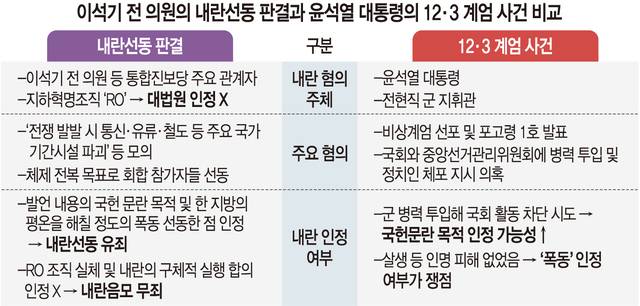 12·3 비상계엄 사태 후 검찰·경찰·고위공직자범죄수사처의 전방위 수사가 진행 중인 가운데 가장 최근 선고된 내란 사건인 이석기 전 통합진보당 의원 판결에도 관심이 쏠린다. 이 전 의원 판결에 비춰봤을 때 윤석열 대통령은 실제 군 병력을 동원해 국회 무력화 시도에 나섰다는 점에서 유죄 인정 가능성이 더 크다는 평가가 나온다. 다만 폭동 고의성 여부에 다툼의 여지가 있다는 시각도 있다.