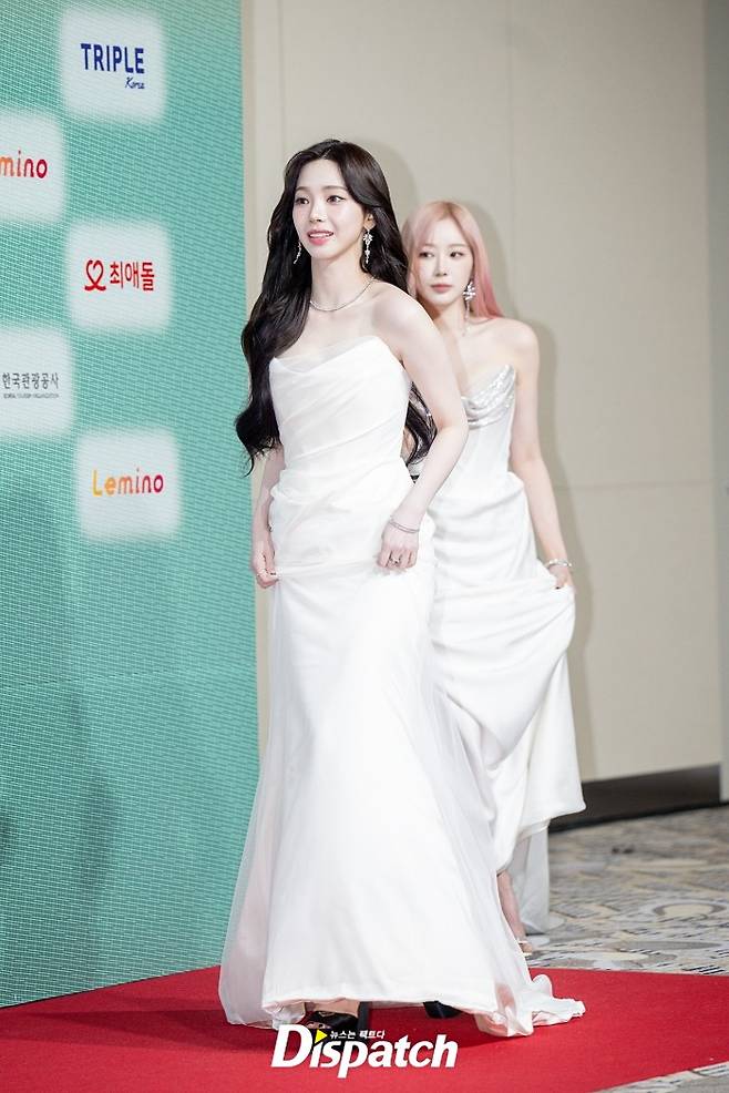 '에스파'는 화이트 드레스로 아름다움을 뽐냈다. 카리나는 튜브톱 스타일로 여신같은 자태를 드러냈다.